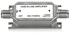 Усилитель спутниковой ПЧ на 10dB. Используется для компенсации потерь сигнала между конвертором LNB и приемником. Включается в разрыв кабеля между LNB и ресивером, питание 13/18 В по коаксиальному кабелю. Используется в случае если расстояние между антенной и ресивером более 40 м. так же ставится, когда сильные затухания в канале по иным причинам.